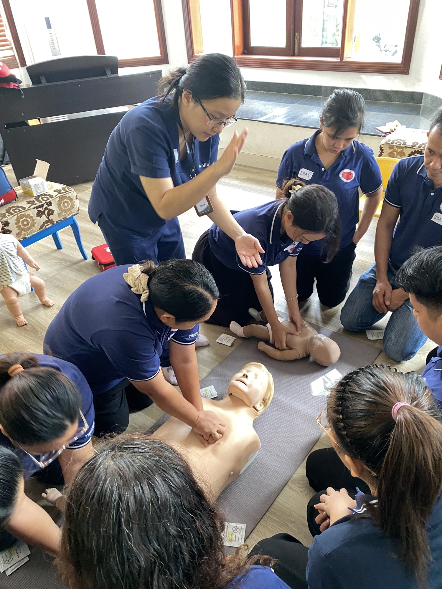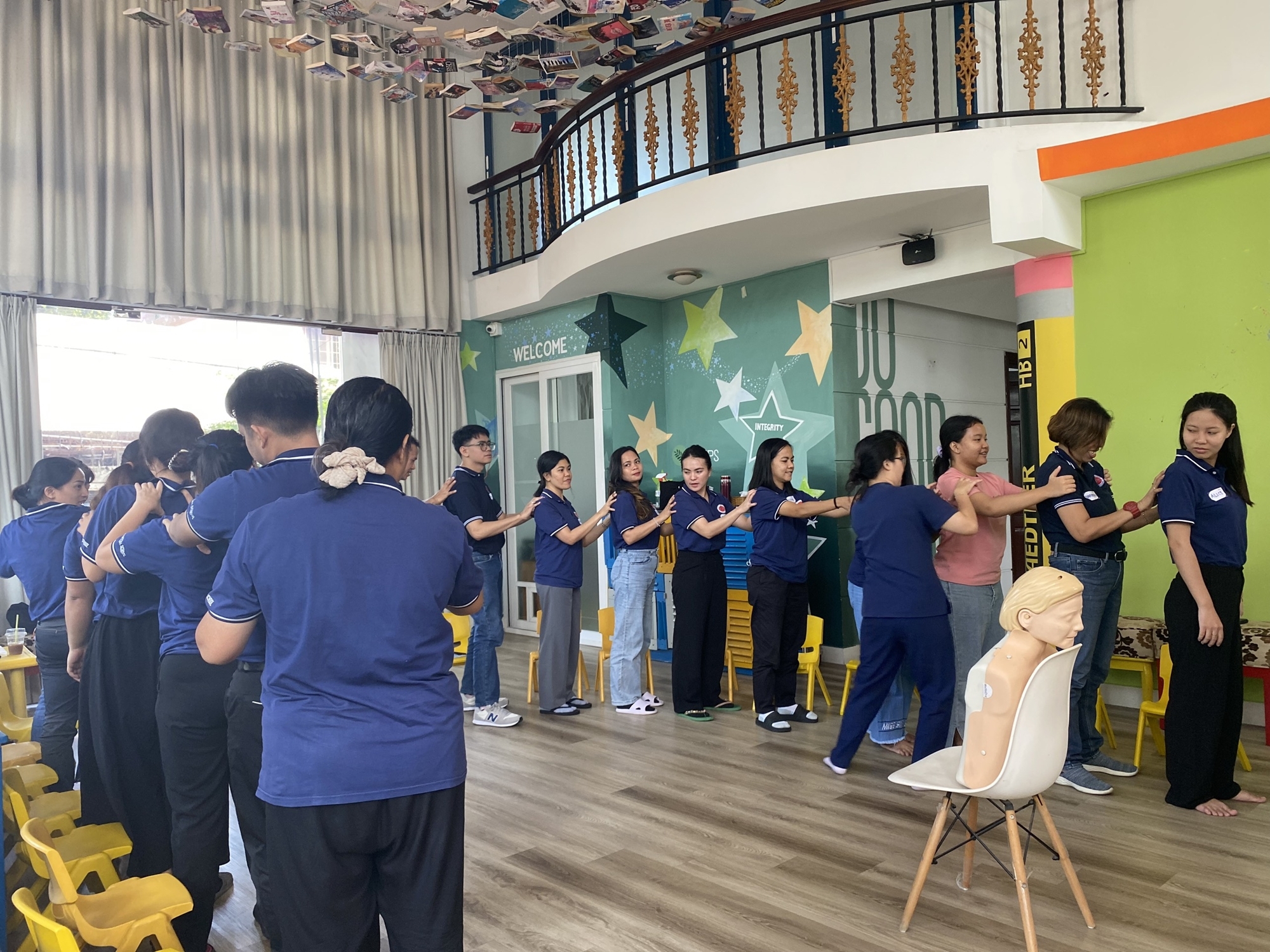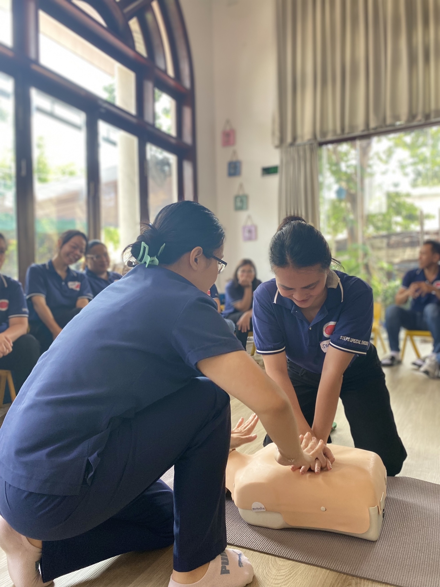 Thấu hiểu điều đó, Trung tâm Giáo Dục Đặc Biệt STEPS tổ chức buổi đào tạo sơ cấp cứu với Wellbeing - Đào tạo sơ cấp cứu & AED cho toàn thể giáo viên và nhân viên do Bác sĩ Nhung đến từ Bệnh viện nhi đồng hướng dẫn.